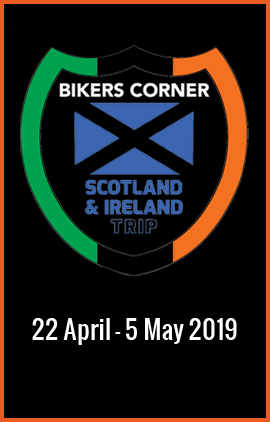 BIKERS CORNER trips to scotland and Ireland (Edinburgh, Aberdeen, Evanton, Glasgow, Belfast, Dublin, Galway, Sligo, Letterkenny, Belfast, Glasgow, Edinburgh) as follow: Trip: 14 Days (22 April - 5 May 2019)